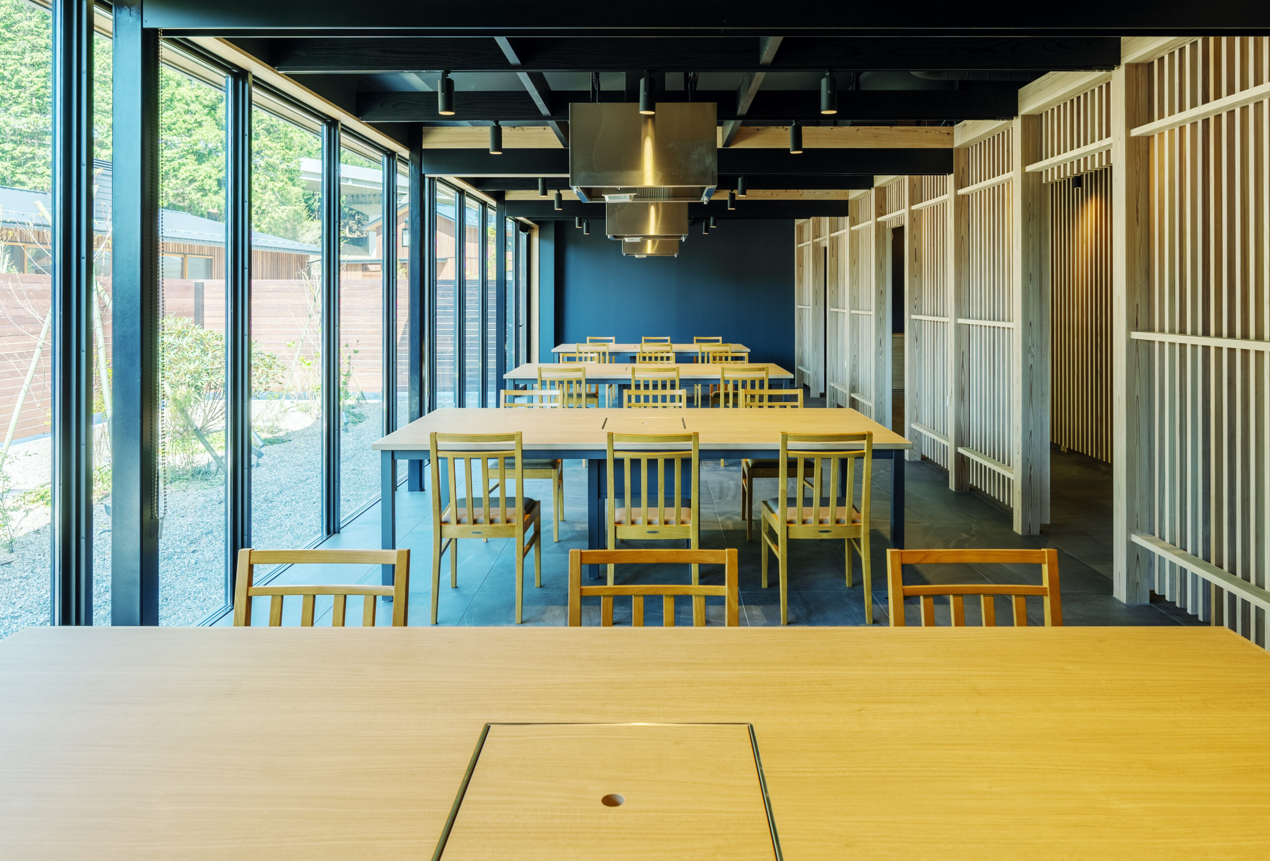 外来者向けレストラン。テーブル間の天井にはロールカーテンを設置。テーブルの向きも変えられるおかげで、簡単にレイアウトが変更できる