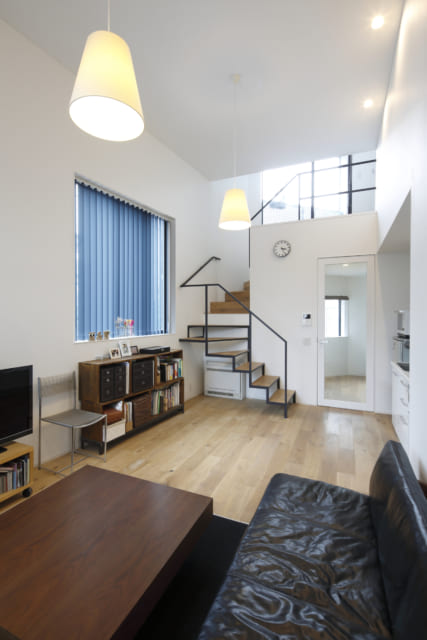 • 壁面を有効活用した収納棚の裏は、下階へと続く階段。天井を格子状にすることで、室内の明かりを下の階へと導きつつ、広々としたリビングダイニングとしている。