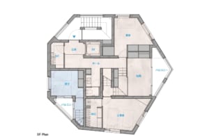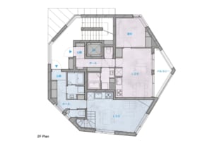 またスキップフロアの採用によって、2階に2部屋ある賃貸住戸のうち、1部屋はメゾネットタイプ、もう1部屋は天井高が約1.5層の高天井とできるなど、魅力的な賃貸住宅となっている。